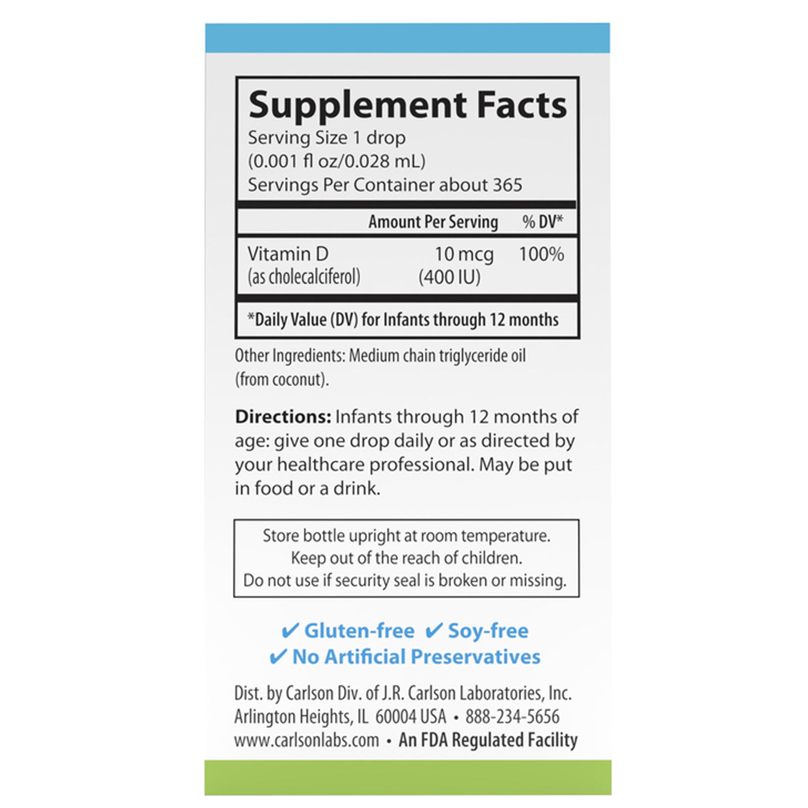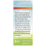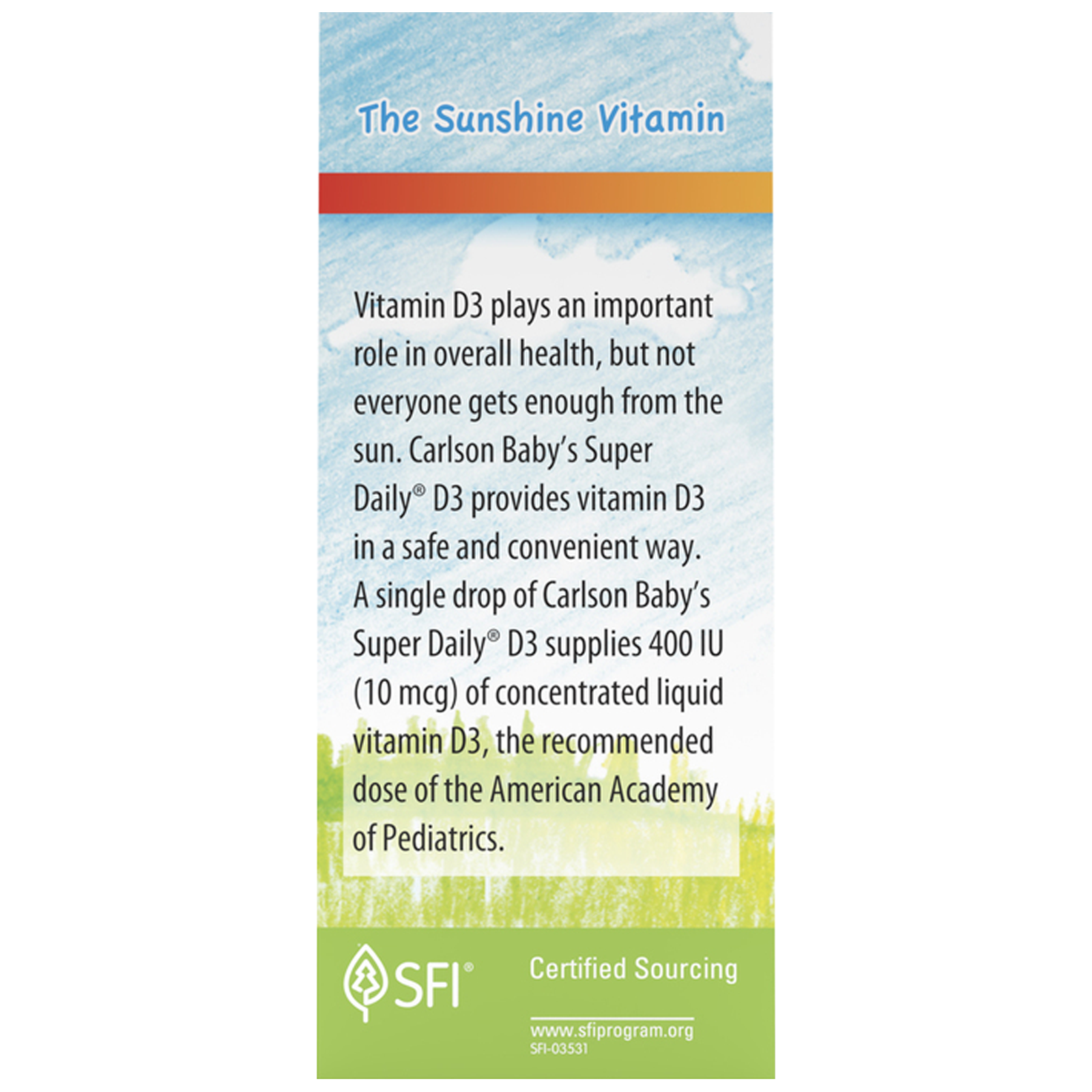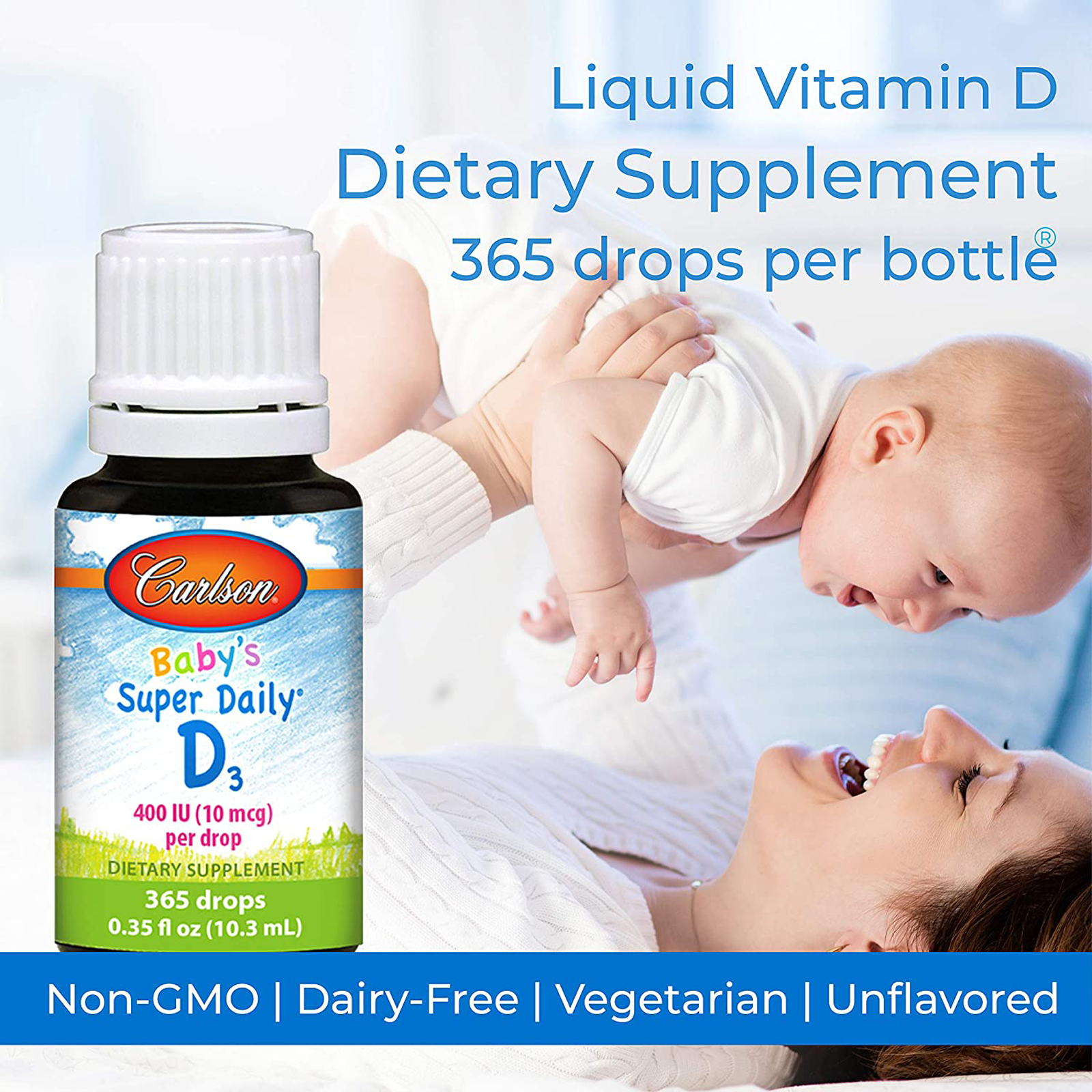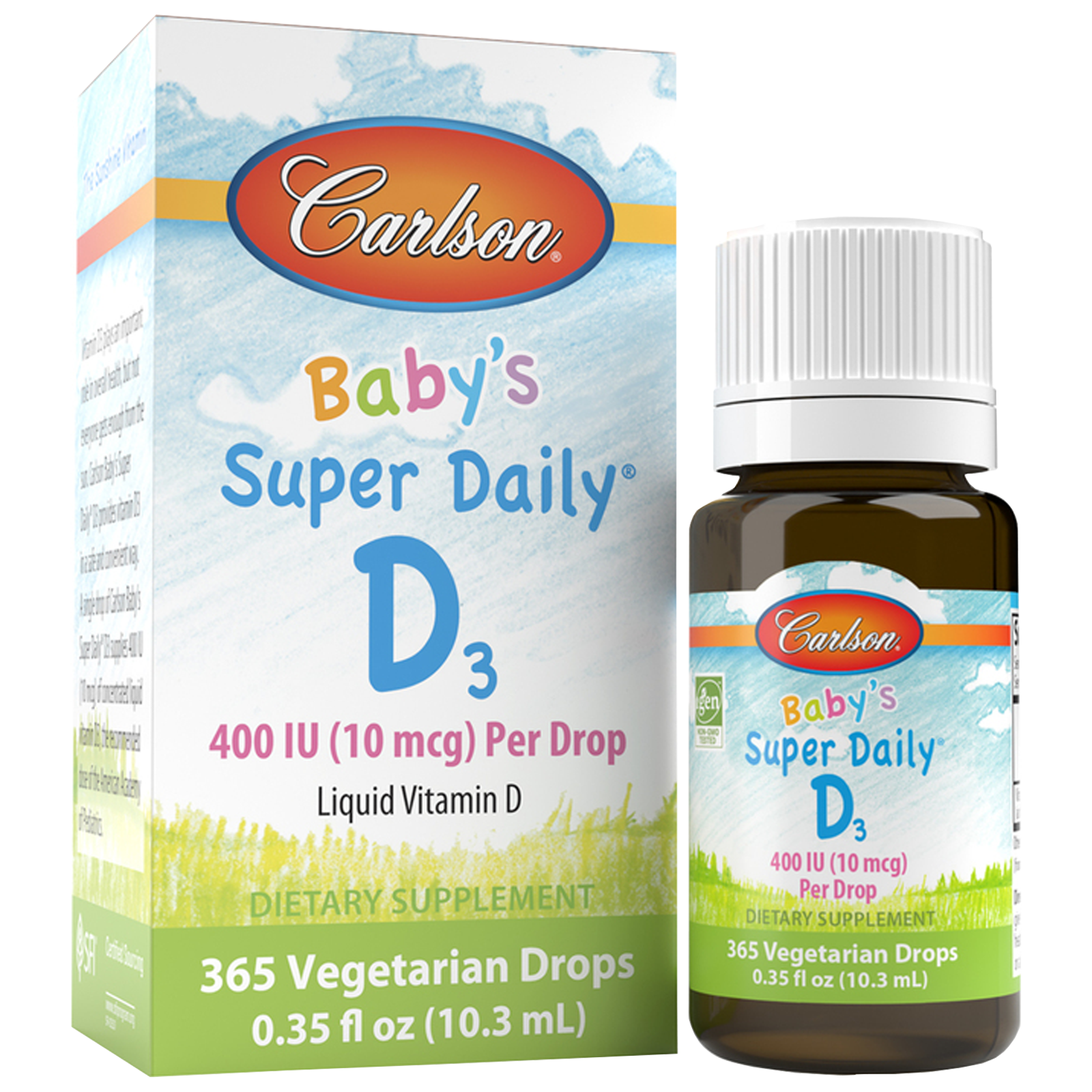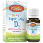 Vitamin D3 plays an important role in overall health, but not everyone gets enough from the sun. Carlson Baby’s Super Daily® D3 provides vitamin D3 in a safe and convenient way. A single drop of Carlson Baby’s Super Daily® D3 supplies 400 IU (10 mcg) of concentrated liquid vitamin D3, the recommended dose of the American Academy of Pediatrics.