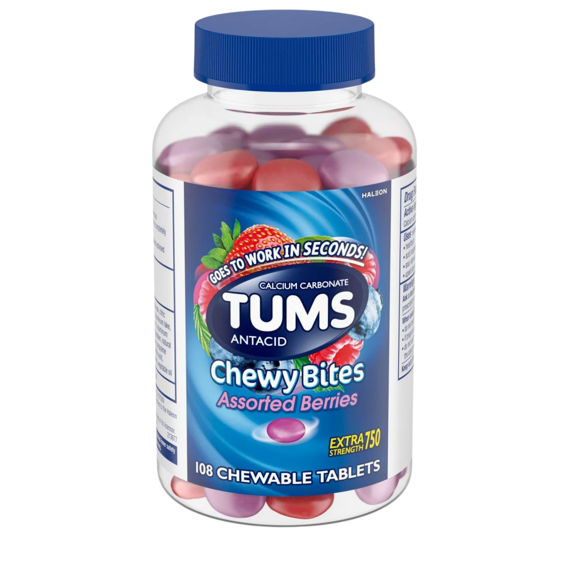 TUMS Chewy Bites Antacid Tablets for Heartburn Relief, Assorted Berries (108 Ct) TUMS Chewy Bites Chewable Antacid Tablets go to work in seconds to make heartburn relief simple and delicious. When symptoms occur, take two to four chewable antacids, depending on the severity of your acid indigestion. TUMS Chewy Bites Assorted Berries 108 chewable tablets Extra Strength 750 mg Goes to work in seconds! Relieves heartburn, acid indigestion and sour stomach For ages 12 and up