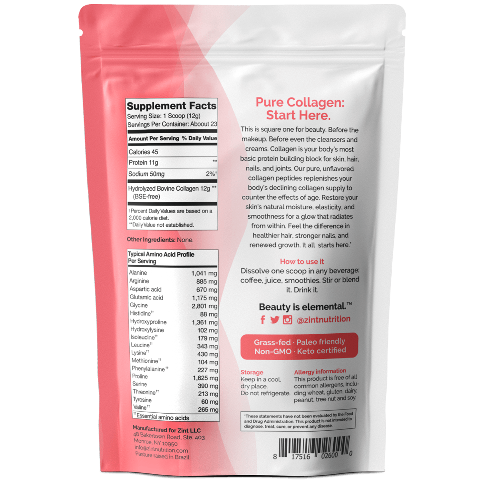 - Essential Amino Acids — Featuring collagen types I & III, Zint Collagen Hydrolysate features 18 amino acids including glycine, proline, hydroxyproline & arginine.