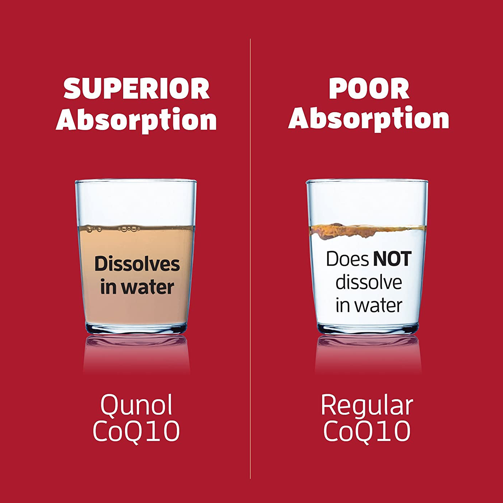 The problem with regular CoQ10 supplements is that they do not dissolve in water and dissolve poorly in fat and, therefore, have poor absorption. Qunol® Mega CoQ10 is different. Qunol® Mega’s patented formulation is both water and fat-soluble and provides superior absorption compared to regular CoQ10.