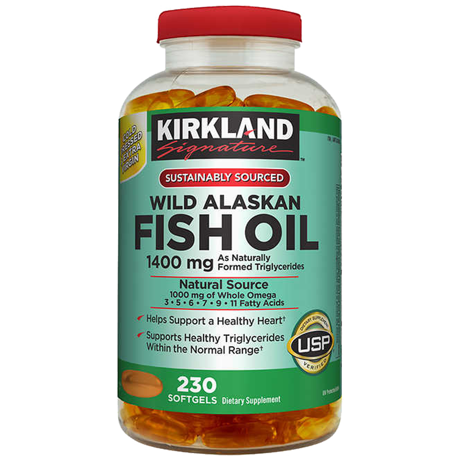 Kirkland Signature™ Wild Alaskan Fish Oil 1400 mg is a naturally formed triglyceride (nTG) made using a proprietary cold-press extraction process, which protects the oil from damaging high heat and eliminates the need for additional refining and chemical treatments. The result is a safe, clean, extra-virgin oil that’s still in the same nutrient-rich form that’s found in fresh fish.