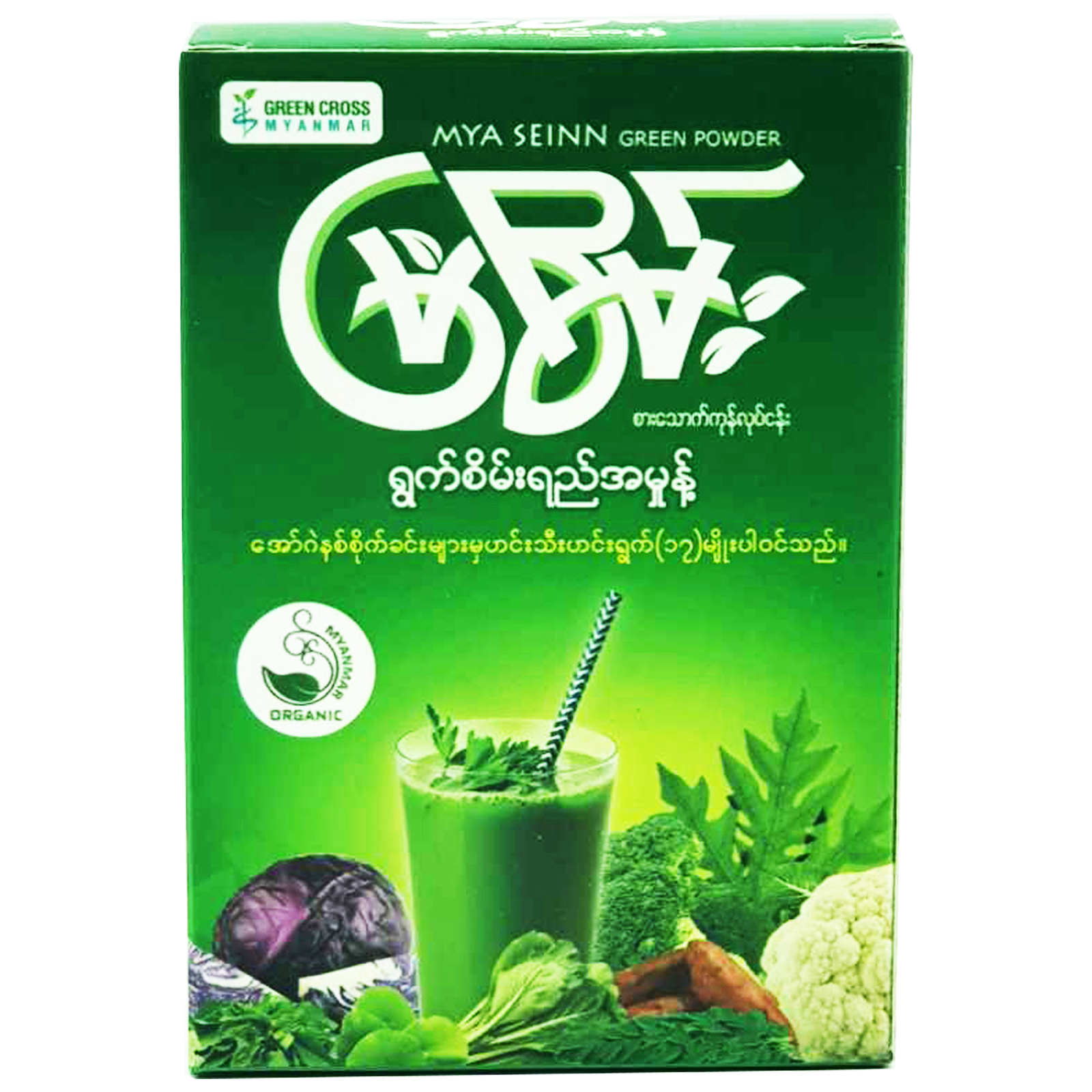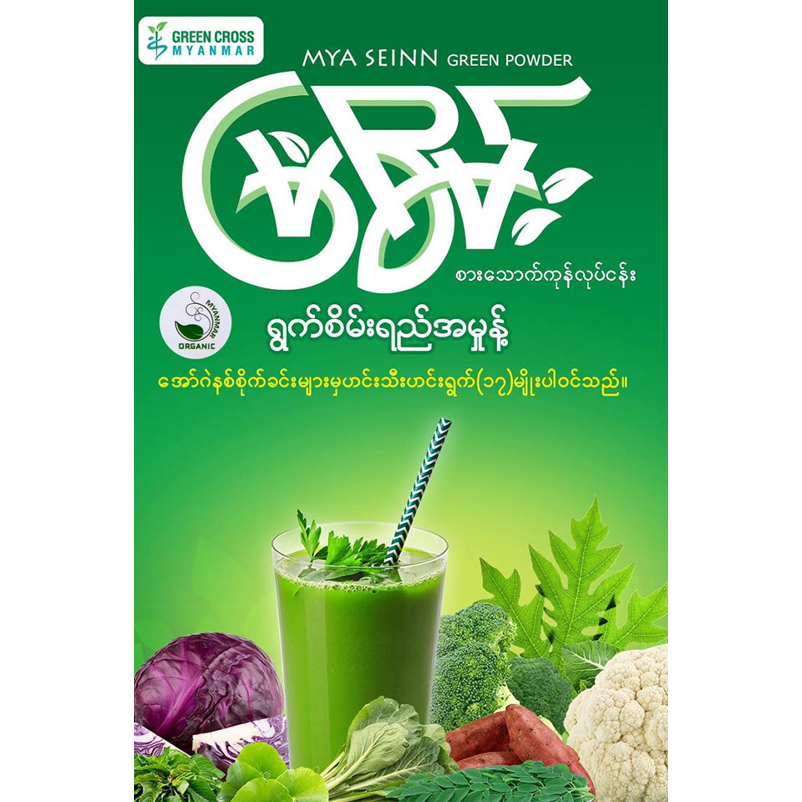 မြစိမ်းရွက်စိမ်းရည်အမှုန့်မှာဟင်းသီးဟင်းရွက် ၁၇ မျိုးပါဝင်ပါတယ်။ပါဝင်တဲ့ဟင်းသီးဟင်းရွက်တွေက အော်ဂဲနစ်သီးသန့်ကိုပဲအသုံးပြု့ထားတဲ့အတွက် ဓာတုဆေးဝါးတွေရဲ့