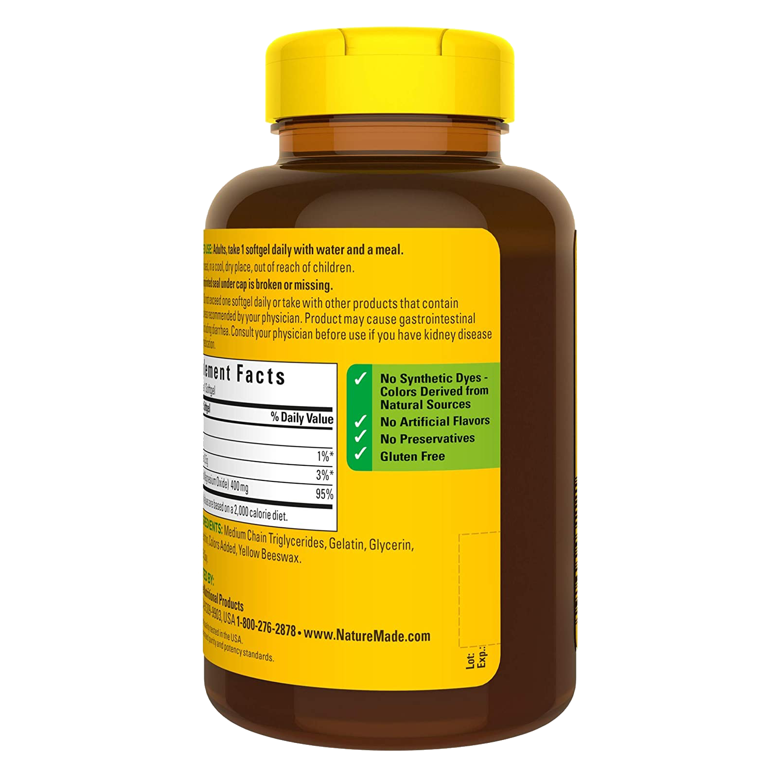 - These gluten free Nature Made Magnesium 400 mg Softgels have no synthetic dyes, no artificial flavors, and no preservatives
