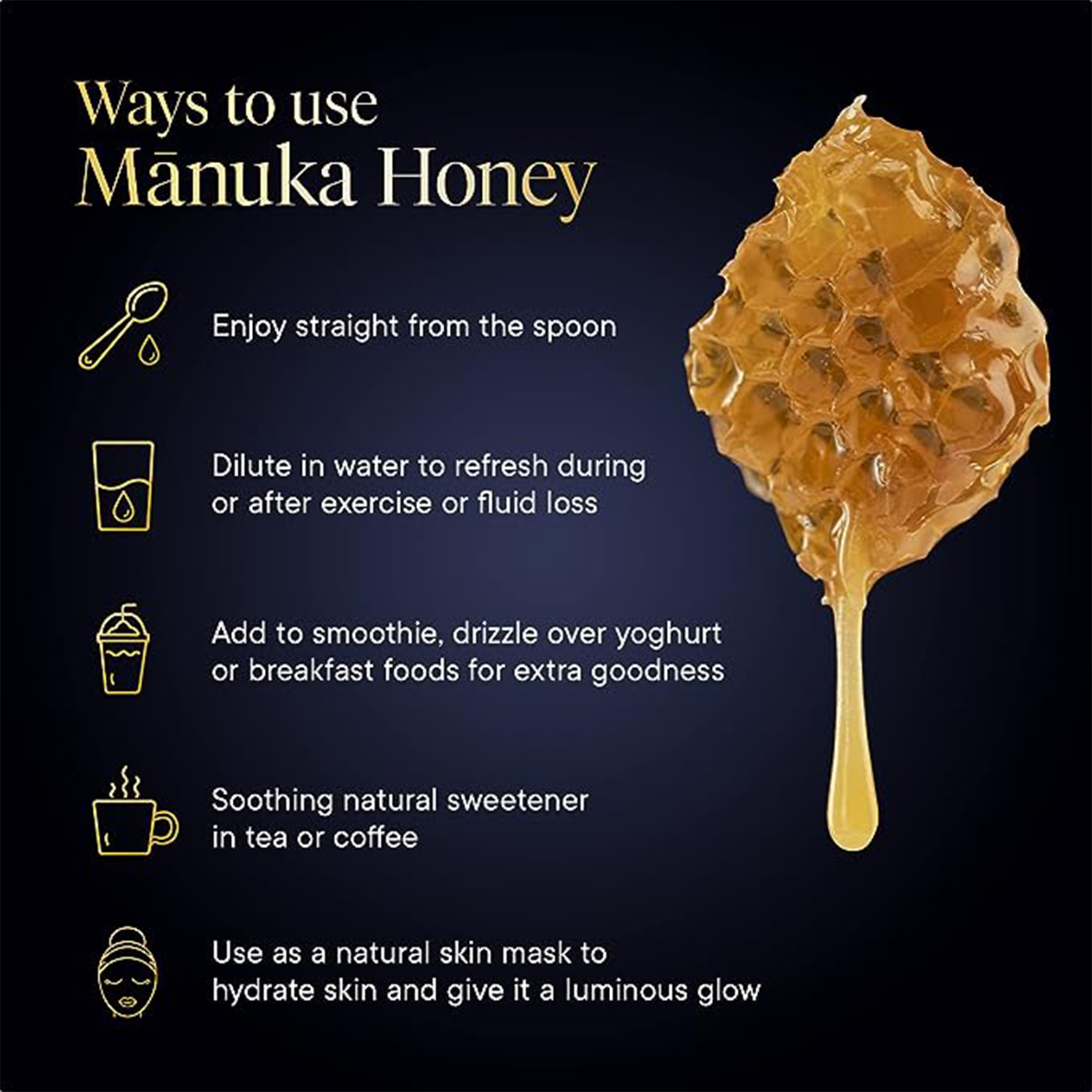 The magic of Manuka honey: Beyond drizzling on foods as a delicious spread or wholefood sweetener, Manuka honey can be used for skincare treatments, as a digestive soother, and for a natural pre- or post-workout boost.
