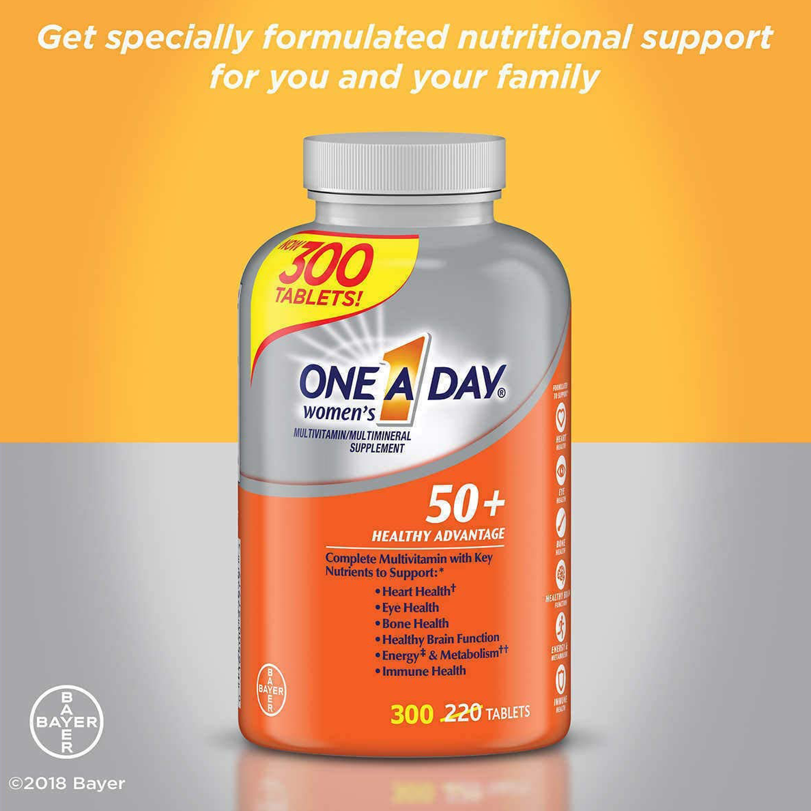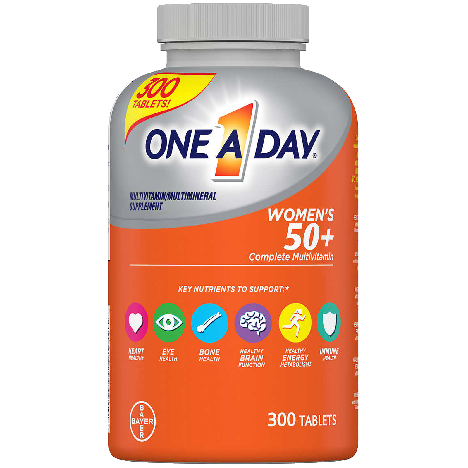 One A Day Women’s 50+ supports:* healthy brain function, bone health, heart health 2, eye health and immune health.* -