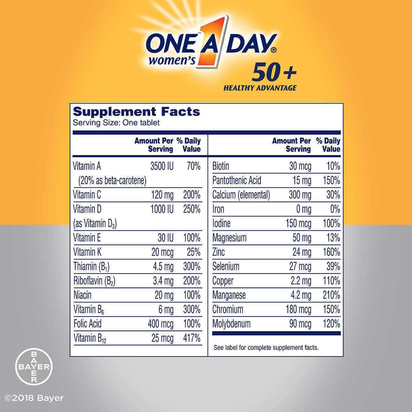 - 1 A Day Women’s 50+ Healthy Advantage Multivitamin offers a wide variety of key nutrients in an easy to take, daily tablet