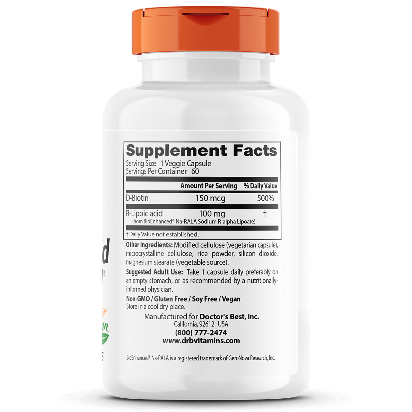 Doctor’s Best Stabilized R-Lipoic Acid contains BioEnhanced® Na-RALA, the sodium salt of R-Lipoic acid (RLA). BioEnhanced® Na-RALA is in its natural and stabilized form of RLA that won’t degrade at high temperatures, and is more bioavailable and biologically active. Lipoic acid (LA) plays an important role in glucose metabolism and energy production. LA is both fat and water soluble. Studies suggests that LA may support the body’s antioxidant defenses. D-Biotin is an integral part of enzyme activity necessary for the breakdown and conversion of fatty acids and carbohydrates into energy.