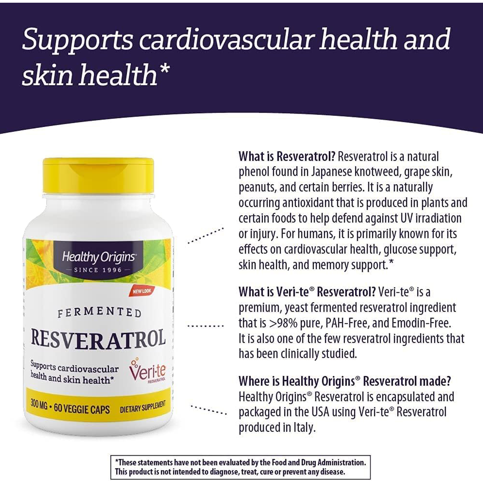 Red wine extract resveratrol is an active polyphenol found primarily in grapes. Has been found to have potent antioxidant activity. Resveratrol, combined with other polyphenols may provide protective support to the cardiovascular system. Is known for its anti aging effects.