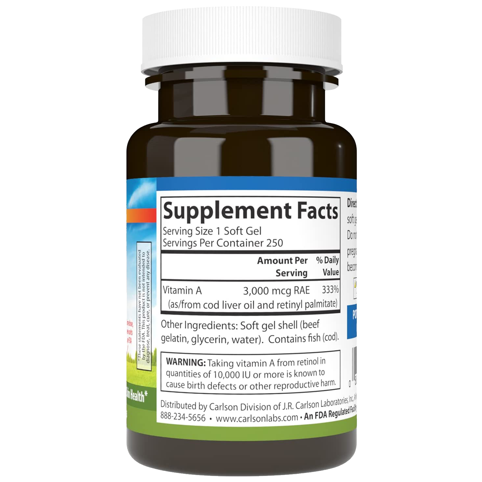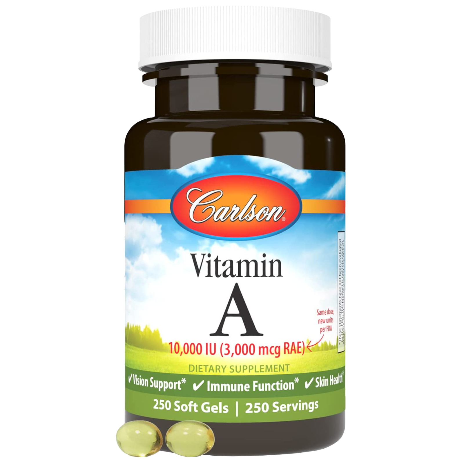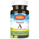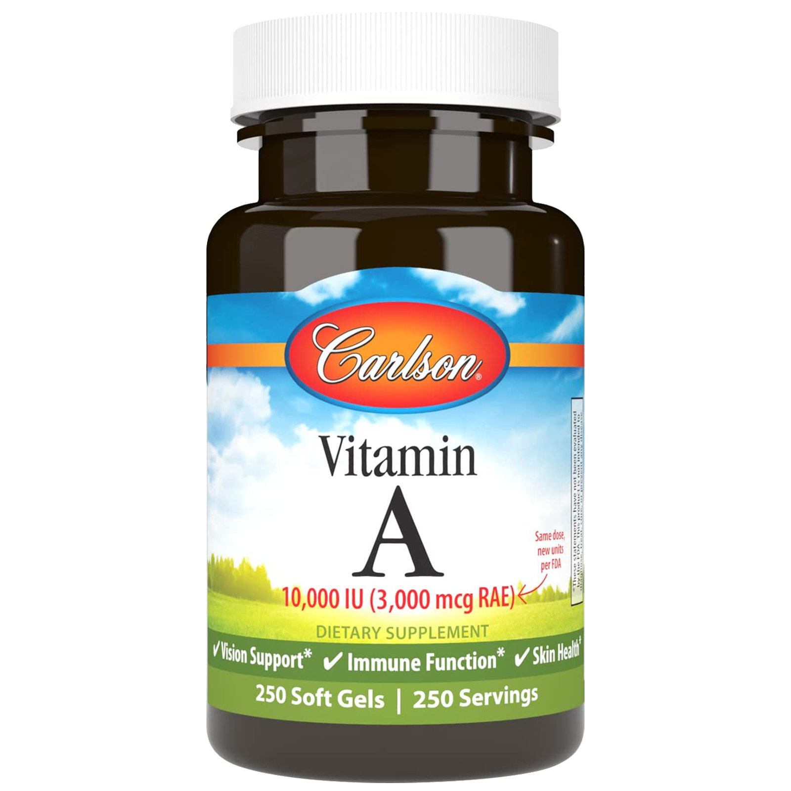 Vitamin A 10,000 IU (3,000 mcg RAE) is important for healthy vision. It plays an important role in helping the eyes adapt to light changes. Carlson Vitamin A also promotes skin, bone, and immune system health.