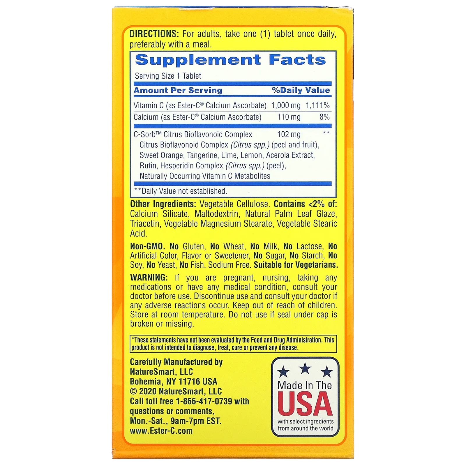 Ester-C 1000 mg with Citrus Bioflavonoids 90 VegTab. Ester-C is a breakthrough patented Vitamin C formula supported with naturally occurring metabolites. Metabolites help enhance the absorption of Vitamin C by your white blood cells, an important part of your immune system.(1) Ester-C’s unique, chemical-free manufacturing process neutralizes pH, making it non-acidic and gentle on the stomach.(1) In a daily 1,000 mg dose, Ester-C delivers 24-hour immune support…so once a day is all you need.(1) Added Citrus Bioflavonoids may help your body better absorb and utilize Vitamin C.(1)24-Hour Immune Support. Gentle on the Stomach100% Vegetarian.