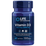 This vitamin D3 supplement delivers 125 mcg (5,000 IU) of vitamin D3 as cholecalciferol per softgel. We suggest that you take a 25-hydroxy vitamin D blood test after 3 months to assess and adjust your dosage. Your optimal blood levels should be 50–80 ng/ml year-round.
